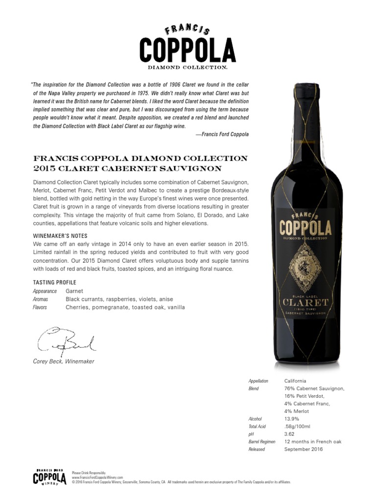Francis Ford Coppola Diamond Collection Black Label Claret 2016 - wine Francis Ford Coppola Diamond Collection Black Label Claret 2016. Cabernet Sauvignon from California. 750 ML / 0 % ABV Other Vintages. All Vintages. Regular price. Currently Unavailable $15.99. Try the ... Francis Ford Coppola Winery, re-opened in July 2010, is the latest venture from Francis Ford Coppola, whose passion for wine, food and ...