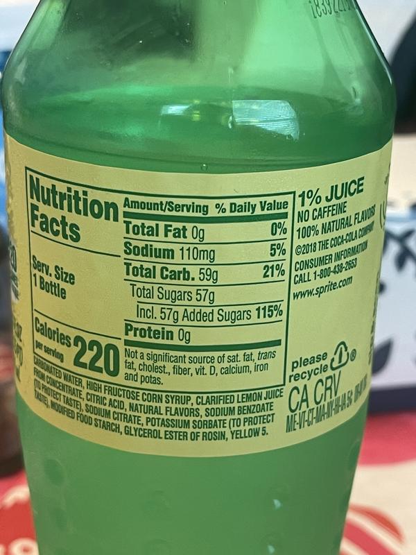 Sprite 6PK of 16.9oz Bottles | Garden Grocer Nutrition Facts Carbonated Water, High Fructose Corn Syrup, Citric Acid, Natural Flavors, Sodium Citrate, Sodium Benzoate (to Protect Taste). Other Products In This Category Sprite 2LTR Bottle $3.91 ($0.06 / oz) Sprite 8PK of 12oz Bottles $8.82 ($0.09 / oz) Sprite Zero 2LTR Bottle $3.91 ($0.06 / oz) Sprite 12PK of 12oz Cans $11.05 ($0.08 / oz) Sprite, 16 fl oz Nutrition Facts - All Menu Price Sprite, 16 fl oz - Nutrition Facts Nutrition Facts Serving Size: 16 fl oz Amount Per Serving Calories 120 % Daily Value* 0 % Total Fat 0g 0 % Saturated Fat 0g Trans Fat 0g 0 % Cholesterol 0mg 1 % Sodium 25mg 10 % Total Carbohydrates 31g 0 % Dietary Fiber 0g Sugars 31g Protein 0g * Percent Daily Values are based on a 2000 calorie diet.