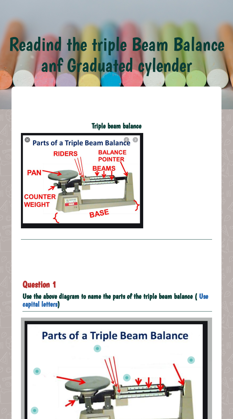Labeled Diagram of triple beam balance? - Answers The triple beam balance was invented by Friedrich Ludwig Jahn. It is a beam balance that registers mass What is the specialty of triple beam balance? A triple beam balance is more accurate than a... Triple Balance Beam Worksheets Teaching Resources | TpT Great practical science basic measurement worksheets focused on reading measurements on a triple beam balance including the labeling of the units (grams).CLICK HERE to SAVE 20% on this activity with our Science Basics Measurement Bundle.This 8 page packet include 2 - 2 pg worksheets and answers keys Subjects: Chemistry, General Science, Science PDF Triple Beam Balance A triple beam balance is a type of lever that is used to measure mass, or the amount of matter in an object. An object with an unknown mass is placed on the measurement tray. On the other side of a fulcrum, a set of sliding weights, called riders, slide on beams to balance the object. Practice using the balance in the Triple Beam Balance Gizmo. 1.
