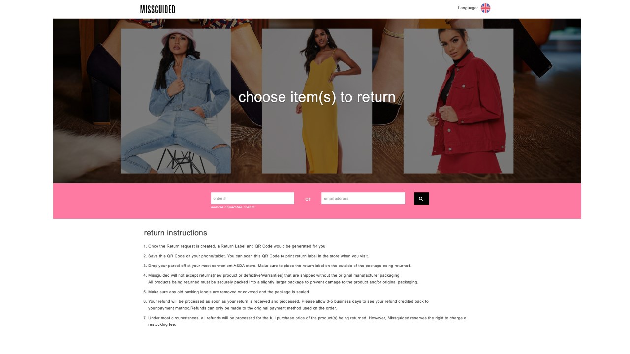 Help - Intelligent Returns You can view Missguided's return policy on the Missguided site. To organise a return, simply follow the steps in our booking process. Then print your shipping documents, enclose the returns form within the package, fix the label to the outside of your package and send the item back through your chosen method. Missguided Returns - Jersey Post Simply follow the steps below to send your free return: Firstly, repack and reseal the items you wish to return. To begin your return, visit Missguided returns portal here. Enter your order number and a secondary piece of information to verify your order. This could be either your delivery post code or email address. Returns - toyou.co.uk Click below to register your return and use Asda toyou as your returns method. You will receive a QR Code or Label which can be used to return your parcel in store. You will receive a QR Code or Label which can be used to return your parcel in store. Simple Returns - Missy Empire Choose one of the returns methods above & attach your label to the outside of your parcel, return your parcel and allow 5 working days to receive an email confirmation of the return being received. I wanna swap my item. We offer a 28 Day return period, parcels should be returned within 14 days of receiving your order for a full refund, parcels ...