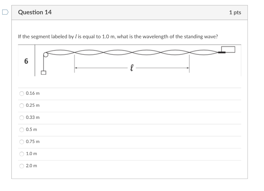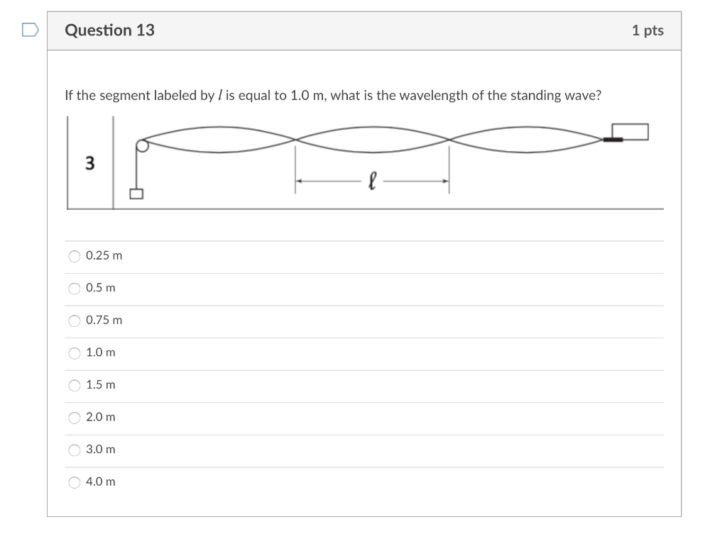 Solved Question 13 1 pts If the segment labeled by l is | Chegg.com Physics questions and answers. Question 13 1 pts If the segment labeled by l is equal to 1.0 m, what is the wavelength of the standing wave? 3 е l 0.25 m 0.5 m 0.75 m 1.0 m 1.5 m 2.0 m 0 3.0 m 4.0 m Question 14 1 pts If the segment labeled by l is equal to 1.0 m, what is the wavelength of the standing wave? 6 р l O 0.16 m O 0.25 m O 0.33 m O ...