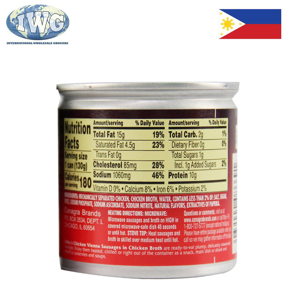 Libby's Vienna Sausage Nutrition Facts - GroceryNutrition.org Libby's Vienna Sausage Nutrition Facts. Serving Size 130g: Calories: 160 Calories From Fat: ... Save on Libby's Vienna Sausage Order Online Delivery | GIANT SmartLabel: Scan or call 1-800-727-5777 for more food information. Questions, visit us at or call Mon. - Fri., 1-800-727-5777 (except national holidays). Heating Directions: Microwave: Microwave sausages and broth on high in covered microwave-safe dish 45 seconds or until hot. Stove Top: Heat sausages and broth in skillet ... Libby's - Vienna Chicken Sausage calories, carbs & nutrition facts ... Libby's Libby's - Vienna Chicken Sausage Serving Size : 4 Links 140 Cal 3% 1g Carbs 77% 12g Fat 20% 7g Protein Track macros, calories, and more with MyFitnessPal. Join for free! Daily Goals How does this food fit into your daily goals? Calorie Goal 1,860 cal 140 / 2,000 cal left Fitness Goals : Heart Healthy Fat 55g 12 / 67 g left Sodium 1,850g LIBBYS Hawaiian Vienna Sausages | Conagra Foodservice Libby's Hawaiian Vienna Sausages offer a delicious snack or addition to your favorite recipes. This delicately seasoned canned sausage is made with chicken, beef and pork and canned in chicken broth for delicious flavor. Enjoy the Hawaiian Vienna sausage right from the can for a quick, flavorful snack, or add them to your favorite casseroles or other recipes for an easy meal.