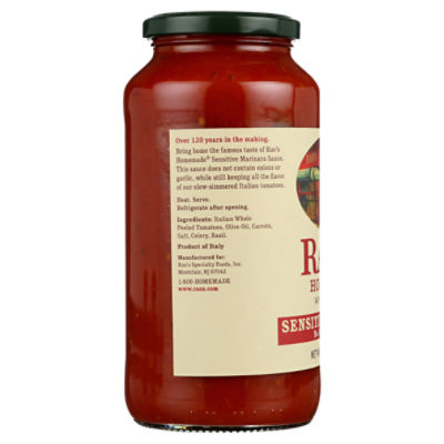 Rao's Homemade Sensitive Marinara Sauce, 24 oz - Fred Meyer Rao's Homemade Sensitive Formula Marinara Sauce is a mild, traditional marinara sauce made with sun ripened Italian plum tomatoes, and sweet Italian cherry tomatoes. ... you how much a nutrient in a serving of food contributes to a daily diet. 2,000 calories a day is used for general nutrition advice. Ingredients Italian Whole Peeled Tomatoes ... Rao's: Homemade All Natural Marinara Sauce Sensitive Formula, 24 Oz Additional information DescriptionFor people who are sensitive to the flavor or the effects of onions or garlic, Rao's developed Sensitive Formula Marinara Sauce which achieves full-bodied taste without the use of onions or garlic. Buying Bulk Pasta Sauce for a Business? Get our best deals when buying Raos in bulk at wholesale prices! Learn More