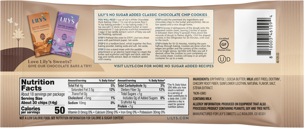 Milk Chocolate - Baking Chips | Lily's Sweets About 33 chips (14g) 60 Calories per serving Amount/serving % Daily Value* Total Fat 4g 5% Saturated Fat 2.5g 13% Trans Fat 0g Cholesterol <5mg 1% Sodium 10mg 0% Amount/serving % Daily Value* Total Carbohydrate 8g 3% Dietary Fiber 3g 13% Total Sugars 1g Included 0g 0% Added Sugars Erythritol 3g Protein 1g