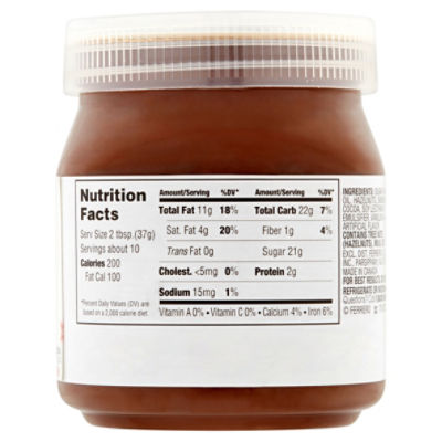 Nutella Nutrition Facts: What's Really In It | BODi Mar 3, 2023 · Nutella Nutrition Facts A serving of Nutella (two tablespoons) contains 200 calories, 12 grams fat, 4 grams saturated fat, 15 milligrams sodium, 23 grams carbohydrates, 21 grams sugars, and 2 grams of protein. Is Nutella Healthy? Ingredients, Nutrition and More Mar 20, 2018 · Two tablespoons (37 grams) of Nutella contain ( 1 ): Calories: 200 Fat: 12 grams Sugar: 21 grams Protein: 2 grams Calcium: 4% of the RDI Iron: 4% the RDI Although Nutella contains a small...