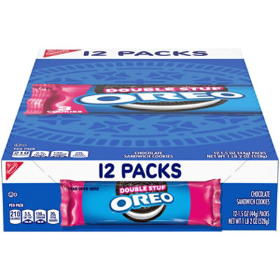 Nabisco Oreo Chocolate Sandwich Cookies Double Stuf Family Size Per 2 Cookies: 140 calories; 2 g sat fat (10% DV); 90 mg sodium (4% DV); 13 g total sugars. Always made with real cocoa. Slit appears when opened. At Oreo we ...