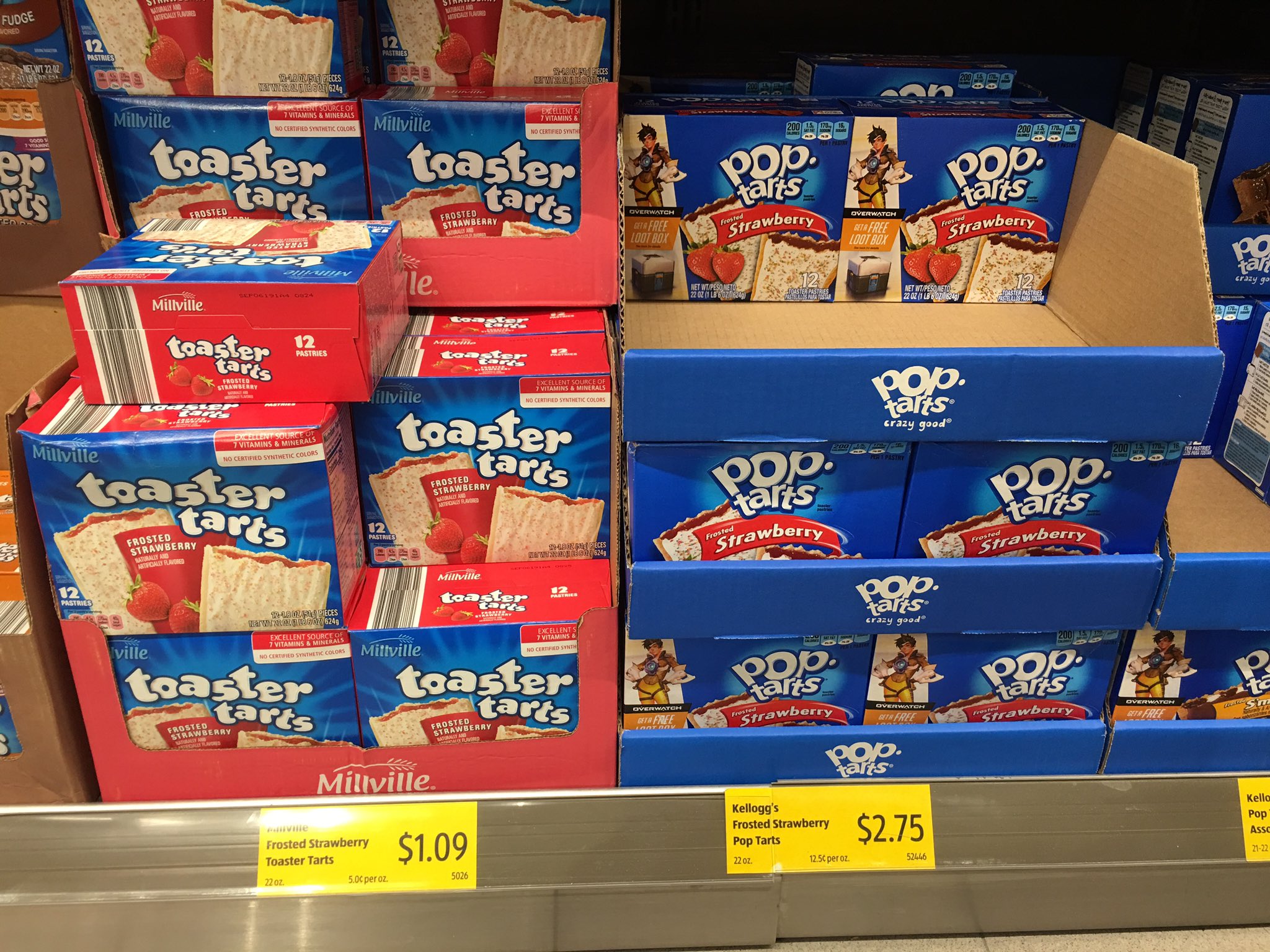 Millville Frosted Strawberry Toaster Tarts (Aldi) Each box contains 12 total pastries, and is offered for less than the national brand (and even some store brands') 8 count boxes: in our case, it's $1.49 per box. That's more pop tarts than I really need, because I tend to get sick of these rather quickly, but you can't argue with the price.