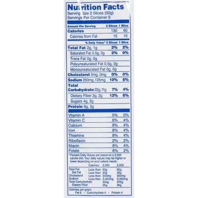Wonder Bread 100% Whole Wheat Allergy and Ingredient Information Wonder Bread 100% Whole Wheat Wonder Bread 100% Whole Wheat.See side panel for information regarding whole grains and heart disease.Nutrition notes 2 slices.No artificial colors, flavors or preservatives.28g whole grains.Good source of fiber.25% less sodium., UPC Code 045000122055 Manufactured by Hostess Brands Inc. ... THIS INGREDIENTS LABEL ... Wonder Bread, Classic White | Publix Super Markets Soft, fluffy and delicious, Wonder® Classic White Bread offers unbeatable taste that will delight all ages. Wonder Classic sliced white bread is the bread that made Wonder a household name. With... Wonder Bread Classic White Allergy and Ingredient Information Nutrition Label Nutrition Facts Serving Size 57.00 g Servings Per Container 10.00 Amount Per Serving Calories 140 % Daily Value* Total Fat 1.5g 2.3% Saturated Fat 0g 0% Trans Fat 0g Cholesterol 0g 0% Sodium 0.18g 7.5% Total Carbohydrates 29g 9.66% Dietary Fiber 2g 8% Sugars 5g Protein 4g Vitamin A 0% Vitamin C 2% Calcium 35% Iron 15% Wonder Bread Italian — Wonder bread Featuring wide slices with a soft and smooth texture, Wonder Italian Bread is a delicious base for garlic bread or a delectable deli sandwich. One 20 oz loaf of Wonder Italian Bread. A low fat food. 0 grams of saturated fat per serving. Just 80 calories per slice. Add To Cart. Facebook 0 Twitter Pinterest 0.
